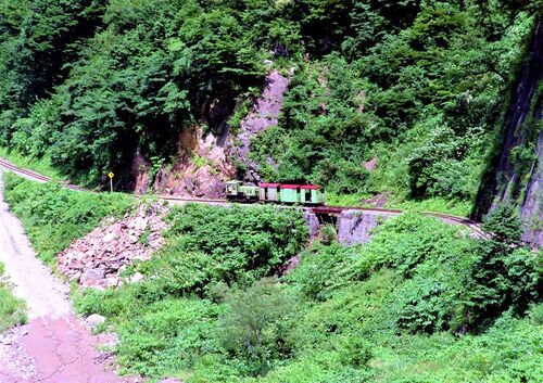 七郎のスイッチバックで休憩していると、頻繁に列車がやって来ました。この場所は眺めが良く、はるか先まで見通せて、ズームレンズがあれば何枚でも連写でき、思わぬフィルムの浪費をしてしまいました。 1.七郎谷付近を下るモーターカー (七郎:1992年8月…