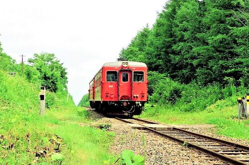 午後になると、霧は無くなりましたが、今度は曇ってきました。線路脇の草むらでアブと戦いながら撮影を続けましたが、同じ様な車両しか来ないのでいい加減飽きて来ました。 1.キハ22319+キハ22116 (上武佐~川北:1987年8月) 今度は、先程キハ27形の回送…