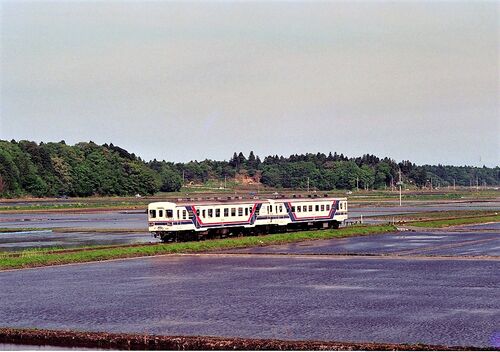 麦畑の次は田園地帯です。この時期の中根周辺は、田植えが終わって一面が鏡の様な水田なのですが、この日は風が強く、水面が波立っており、鏡ではありません。しかし、この時期に相応しい景観でした。 1.キハ202+キハ223 (金上~中根:1995年5月) この日…