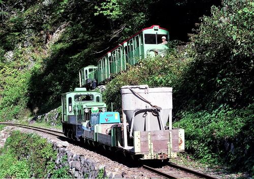この日の朝の続行列車は4本でした。もう山に向かう工事機材はなく、飯場の解体作業員らしき人を乗せた通勤列車がメインの様でした。ところで、本来この時期は、もう紅葉も終わって初冬のはずですが、この年はどういう事なのか、樹木はまだ青々としており、ど…
