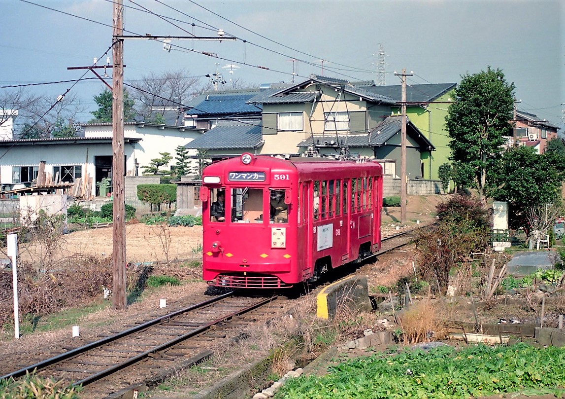そして、駅構内には留置線もあり、モ592が昼寝していました。モ592は予備車なのでしょうか?。もう1両いるモ593は、ここにはいませんでした。モ590形は5両製造されましたが、この時点では3両在籍していました。