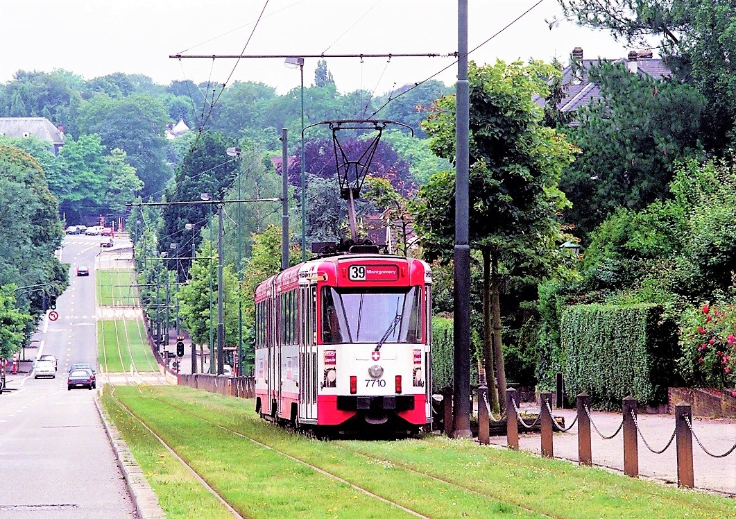 トラム39系統の路線は、Madoux電停を出ると木立を抜けて、急こう配を一気に登ります。この辺りの軌道は手入れが行き届いた緑化軌道が続きます。しかしながら、この一帯は緑が多いところです。手入れが大変だと思いますが、東京もこうありたいですね。